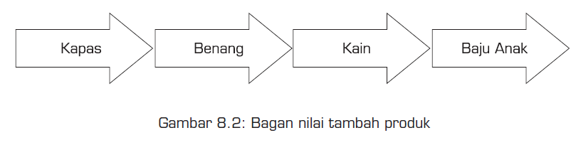 Jika harga per unit kapas Rp10.000,-; benang Rp15.000,-; kain Rp18.000,; dan harga per unit baju anak Rp25.000,-; maka besarnya nilai akhir dan nilai tambah dari benda-benda tersebut adalah sebagai berikut: